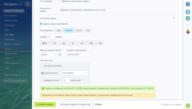Ускорьте работу с задачами, которые регулярно повторяются. По вашему шаблону Битрикс24 поставит задачу за вас в нужное время.