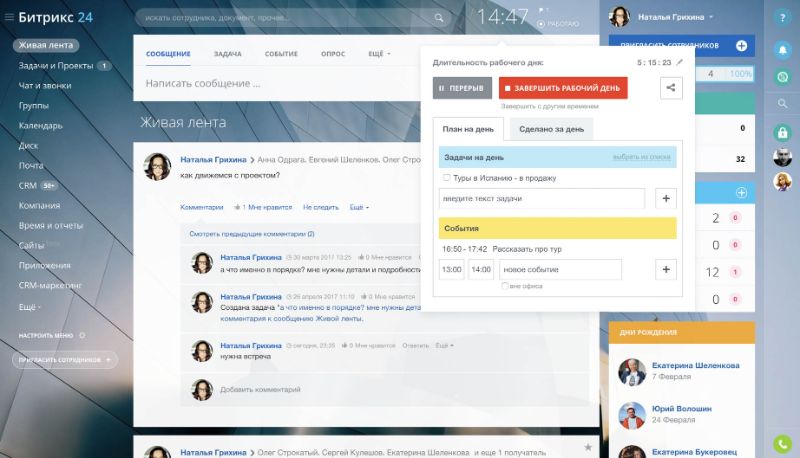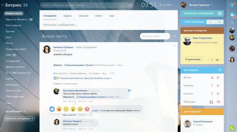 Можно создавать задачи, выражать благодарность, запускать бизнес-процессы, оставлять комментарии к событиям, ставить лайки, устраивать голосования, оповещать ваших коллег о важных событиях и объявлениях.