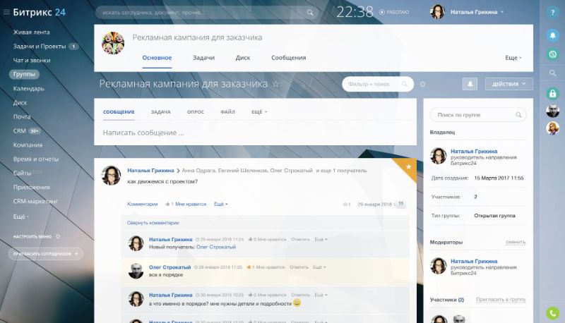 Объединяйтесь в рабочие группы: открытые, закрытые, с внешними подрядчиками, клиентами в экстранете, распределяйте права доступа между участниками.