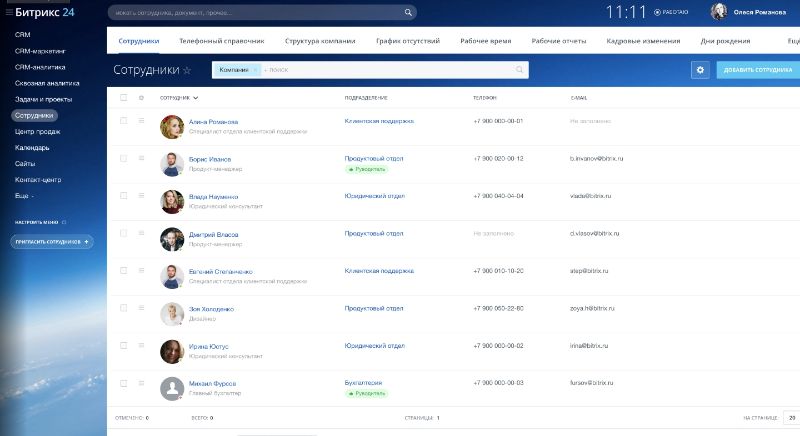 В разделе Сотрудники легко найти нужного человека, сформировав списки по алфавиту или по названию подразделения.
