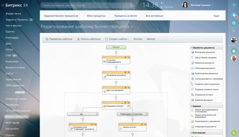 Бизнес-процессы ускорят согласование внутри компании: счета, отпуска, командировки будут автоматически направлены по заданной цепочке к нужным сотрудникам.