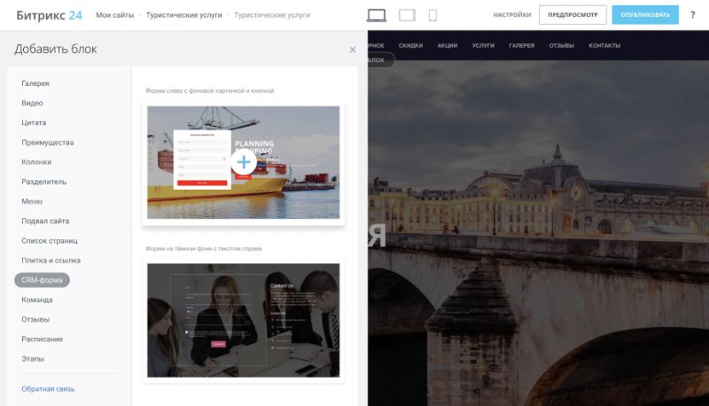 Выбирайте из сотни готовых блоков и добавляйте их на свой сайт: фотогалереи, видео, CRM-формы, расписание и многое другое.